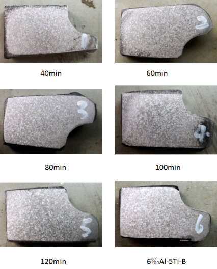 加入6‰Al-5Ti-0.2C對(duì)合金的細(xì)化效果明顯且持續(xù)2小時(shí)不衰退,比加入2‰Al-5Ti-0.2C的細(xì)化效果更好,與加入6‰Al-5Ti-1B細(xì)化劑對(duì)比,效果略好 |