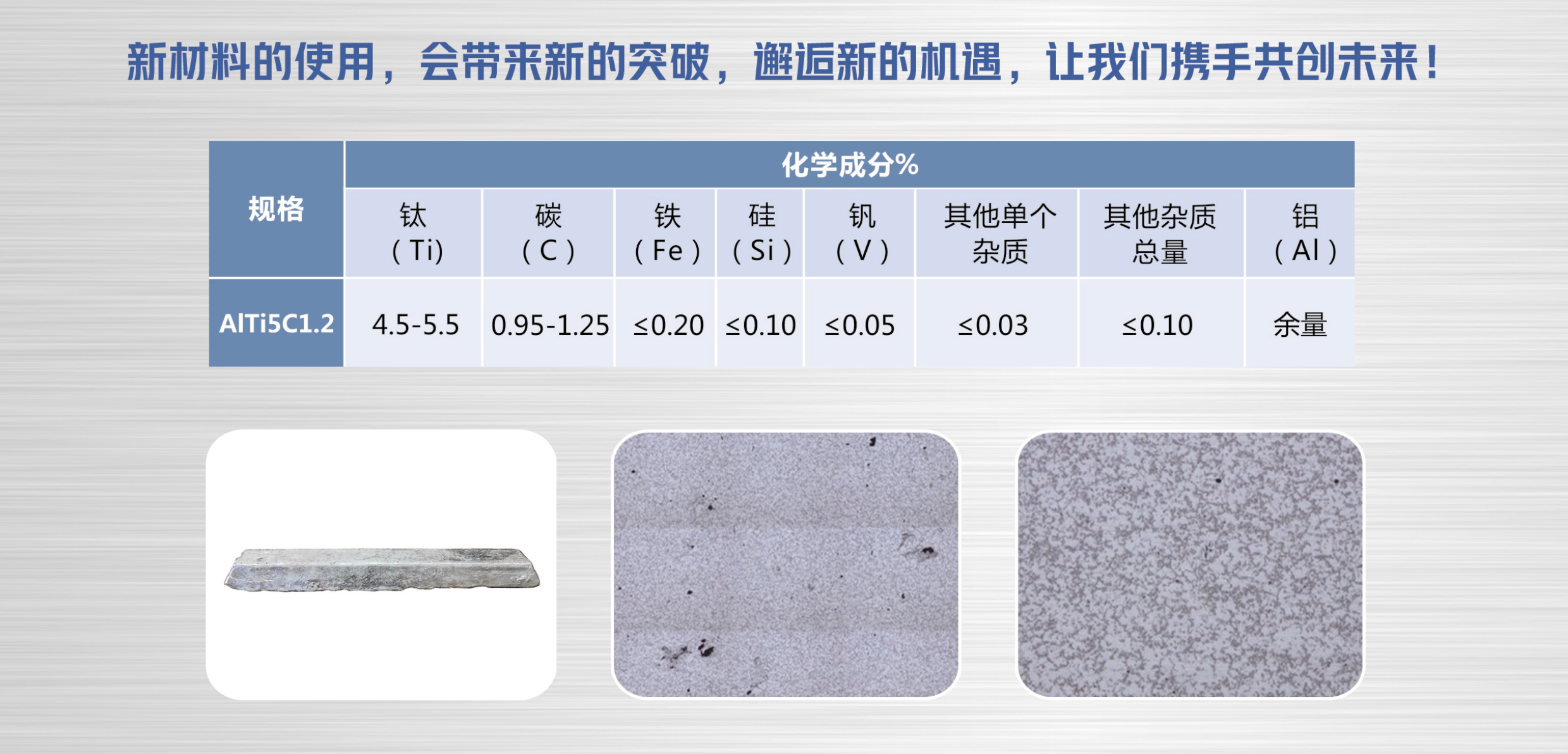 1.AITi5C1.2中TiC陶瓷顆粒時(shí)效性可達(dá)6個(gè)小時(shí),適用于爐內(nèi)添加,操作簡便,適用于大部分需要提升機(jī)械性能的變形鋁合金產(chǎn)品及鑄造鋁合金產(chǎn)品;