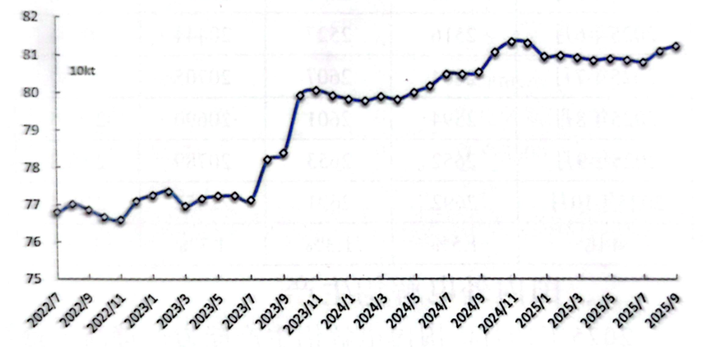 經(jīng)調(diào)整,9月份產(chǎn)量為364.4萬噸;預(yù)計(jì)10月份產(chǎn)量為377.0萬噸,同比增長1.3%,日均產(chǎn)量約12.16萬噸。