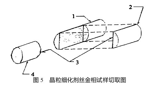 絲:從一卷任意部取一段要求重量的晶粒細化劑;金相檢驗試樣的縱、橫截面如圖5所示;機械性能測量試樣長度應保證300mm。