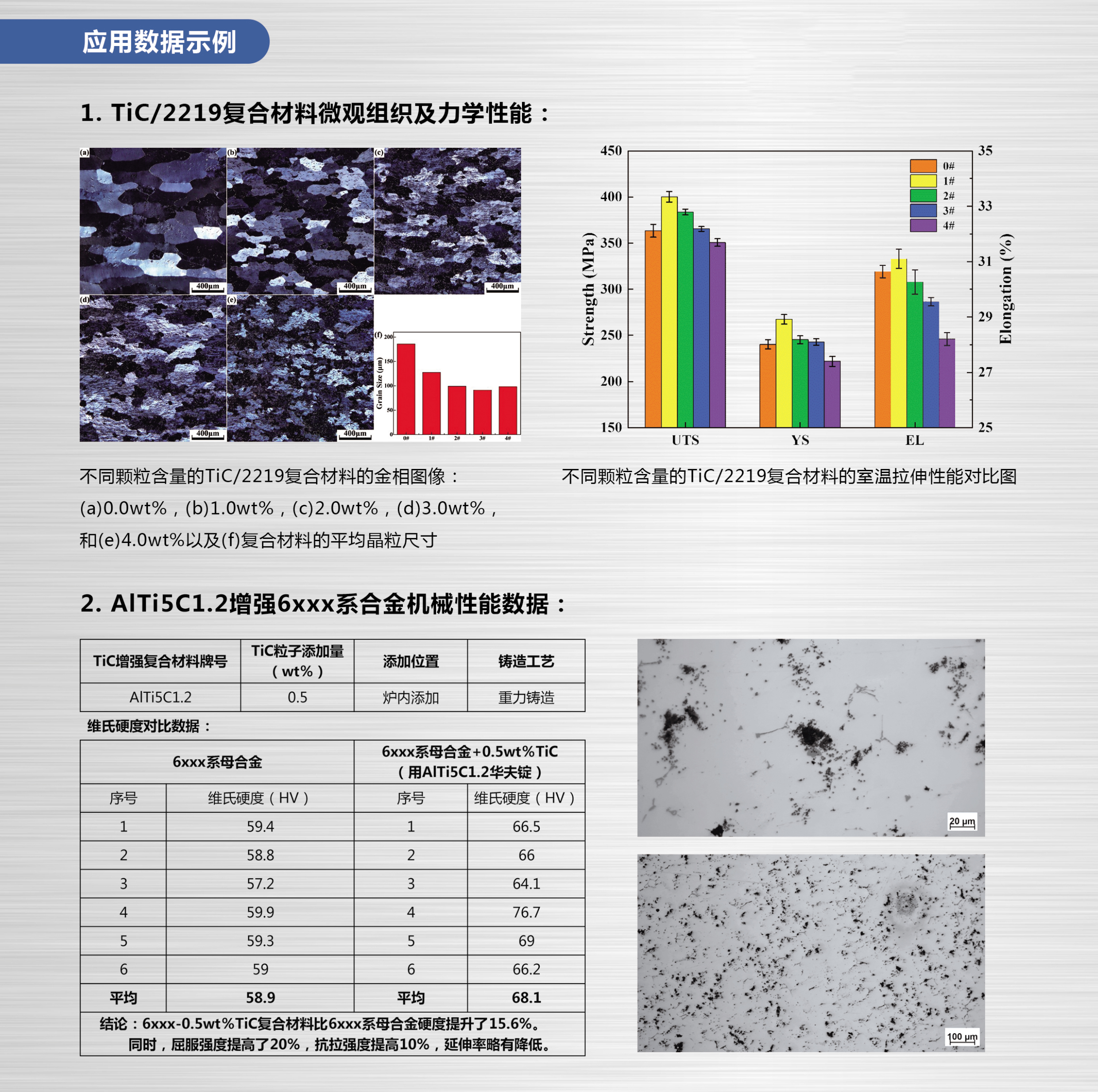 我司(秦皇島峰越科技)推出TIC增強(qiáng)型復(fù)合材料,可提高鋁材高溫力學(xué)性能20%。目前以物理混合形式最多只能在鋁材中加入0.9%質(zhì)量分?jǐn)?shù)的TIC粒子,再多會(huì)產(chǎn)生團(tuán)聚現(xiàn)象,而我司TIC復(fù)合材料可達(dá)6%質(zhì)量分?jǐn)?shù),顯著提高鋁材的抗拉強(qiáng)度和屈服強(qiáng)度。